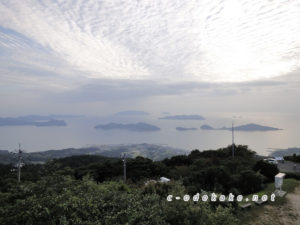 間近に見る風力発電の風車の迫力と、黄金色に輝く瀬戸内海に浮かぶ島々との絶妙なバランスがとても美しい。