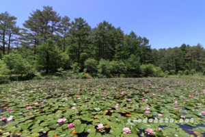 のどかな田園風景にひときわ明るいピンク色の花が田んぼを覆う