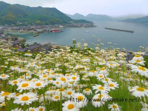 隠れた絶景スポット、瀬戸内海の穏やかな景色とともに、満開の除虫菊が白いじゅうたんのように広がる光景を